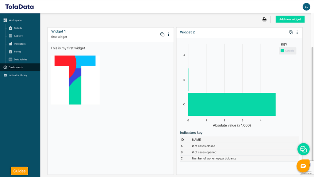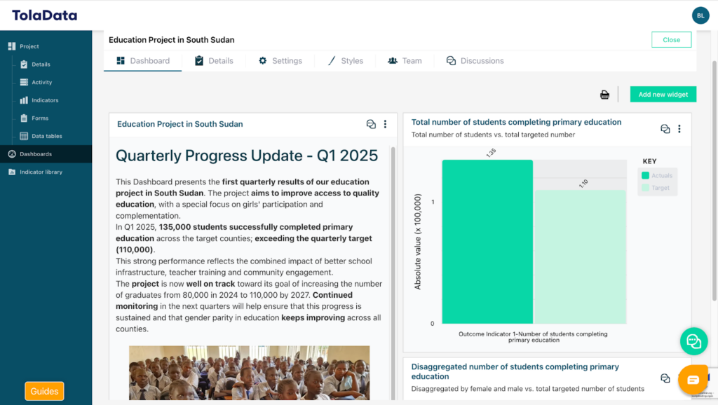 With TolaData, you can build fully customized dashboards that can be shared with both internal team members and external stakeholders. You can create an unlimited number of dashboards and enrich them with elements such as text, images, and visualizations of your indicator results, including disaggregations and cross-indicator comparisons. All data displayed on a dashboard is updated in real time, ensuring that charts and visualizations always reflect the most current information.