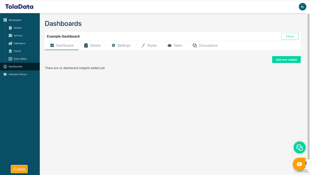 Your newly created dashboard will initially be completely blank, giving you full flexibility to design according to your specific needs and preferences. Each box within the dashboard is referred to as a “widget”. To add a new widget, click on the green “Add New Widget” button.