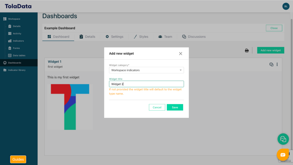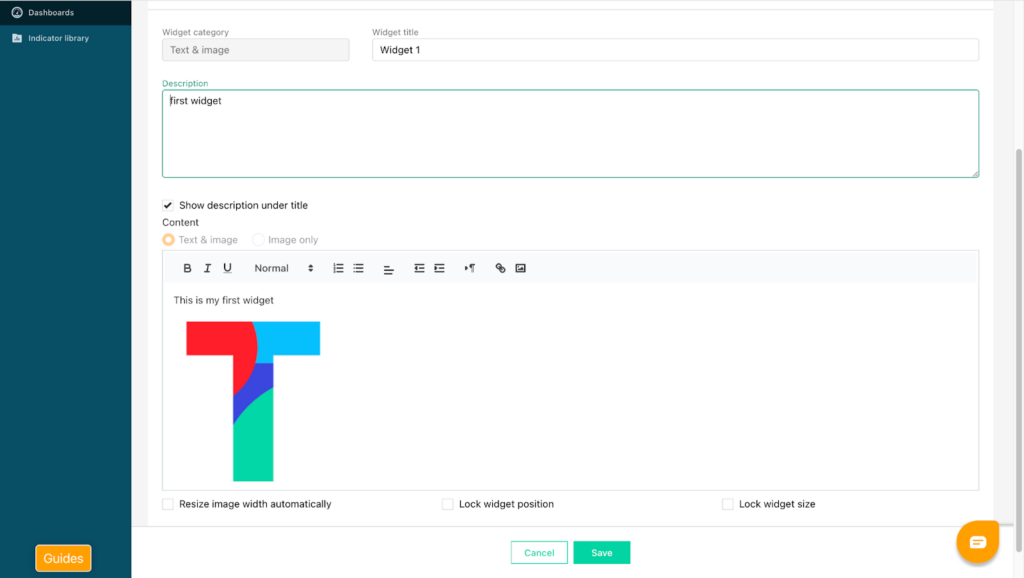 You can adjust the font size, add hyperlinks, and format the content as needed. You may also upload images. Once selected, images will automatically resize to fit the widget dimensions. Click “Save” to add the widget to your dashboard. You can then proceed to add widgets that include charts to visualize indicator results.