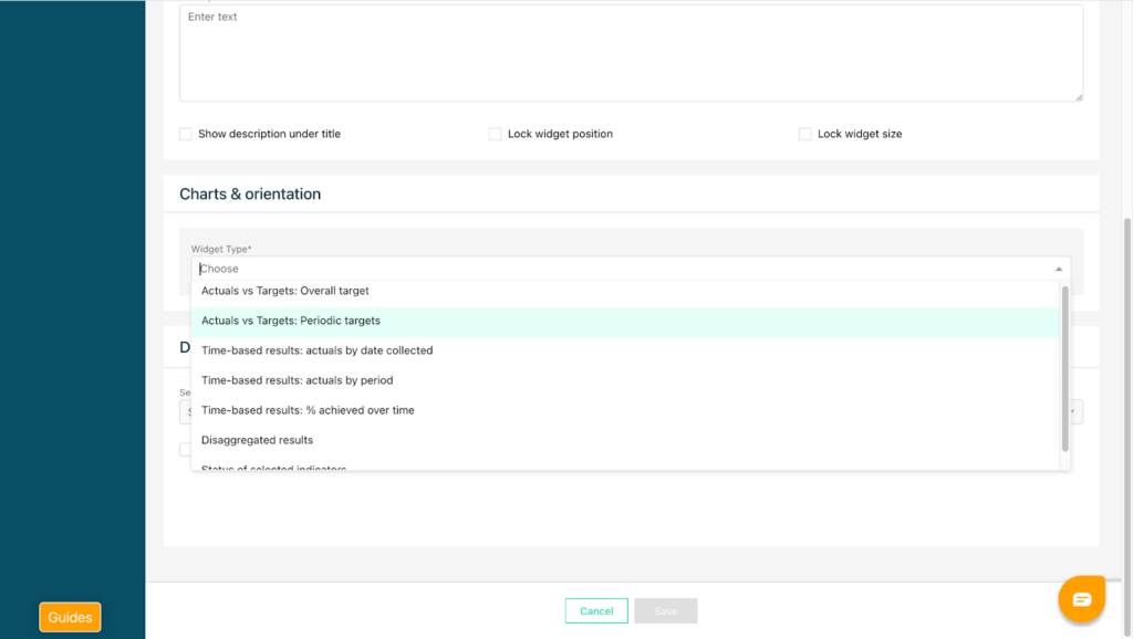 Next, configure the display options. You can choose whether to show target values, whether to include an indicator key, and whether to filter the results by a specific date range. You may also add a custom title and a description for the widget.