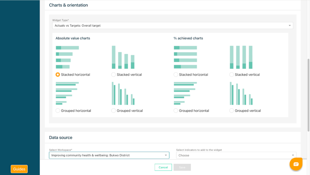 You can choose from seven different chart types, including Actuals versus Targets, Percentage Achieved to Date, Progress Over Time Against Targets, and Disaggregated Results.
