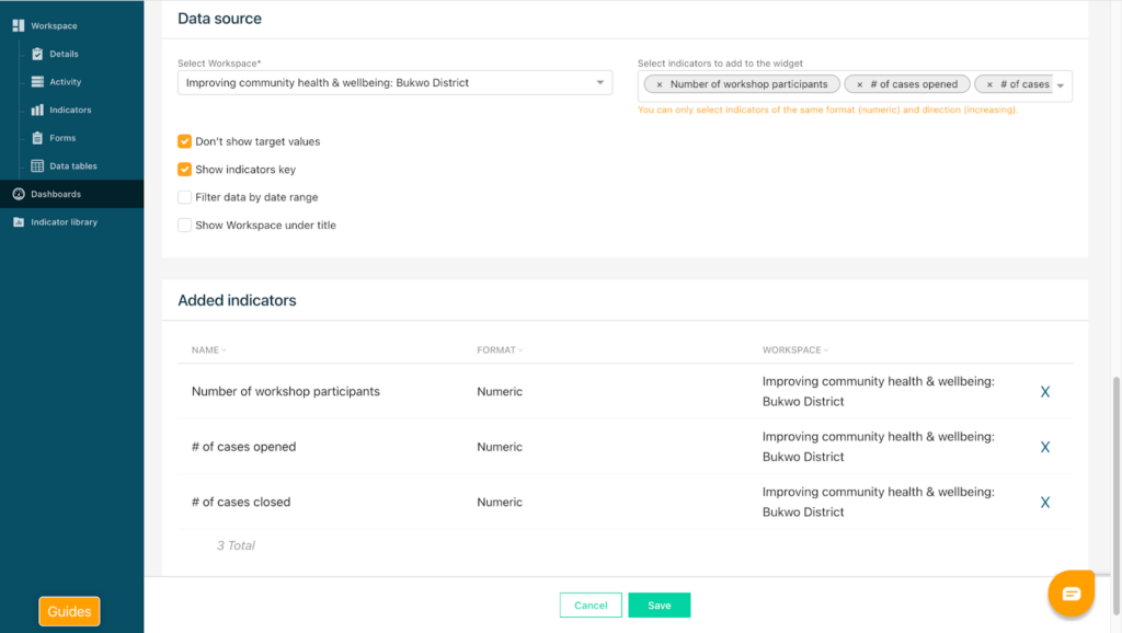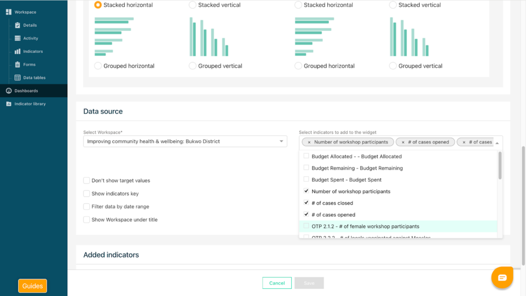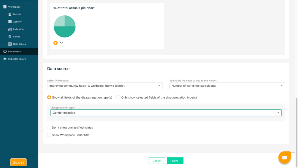 For disaggregation charts, select the disaggregation type you would like to display. All available disaggregation options for that indicator will appear in the drop-down list. You can select to show all fields available for this disaggregation type or to only show selected fields of this disaggregation type. Click Save to display the results on your dashboard.