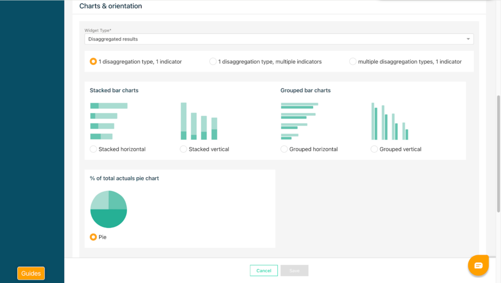To add another indicator widget, click the green button again and select Disaggregated Results. Choose to show 1 disaggregation type and 1 indicator. In other cases, you can present 1 indicator and multiple disaggregation types as well as multiple indicators and 1 disaggregation type on your widget. Choose a disaggregated pie chart, then select the project and the indicator.