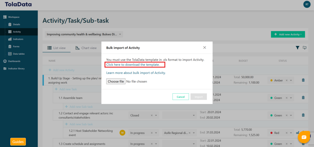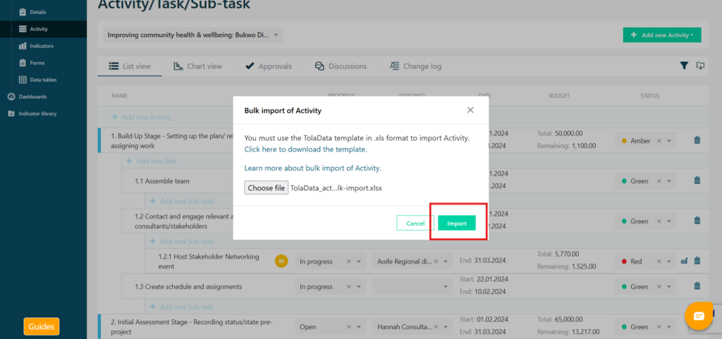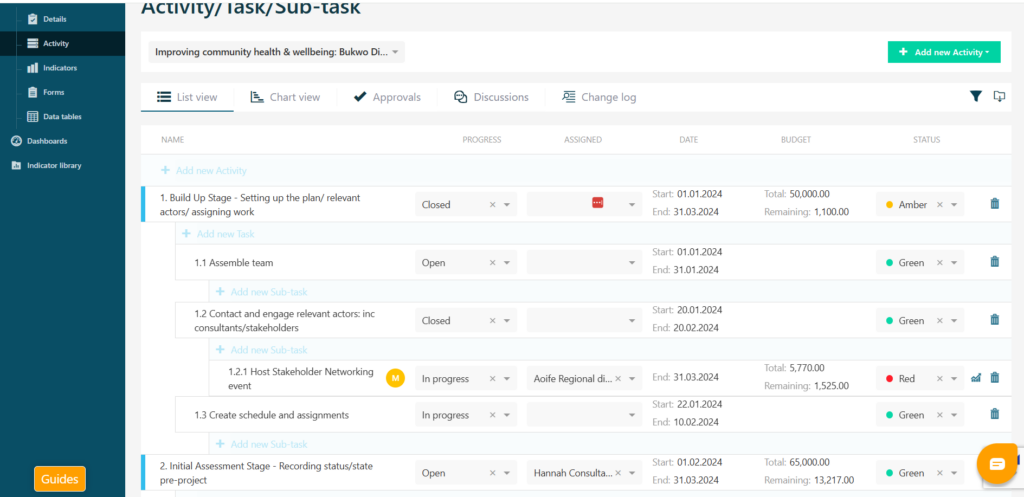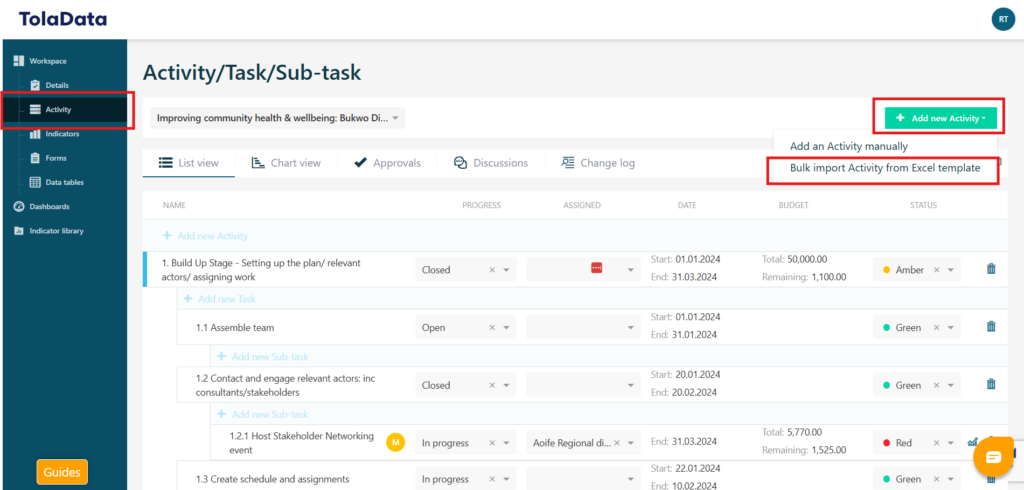 Once imported, activities can be reordered by dragging and dropping. Additional information such as budget data, documentation and assigning staff members responsible for an activity can be added after uploading. To find out more information about the activity section, read this guide.