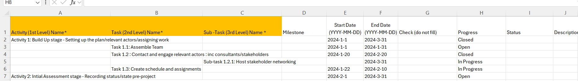 - Each row represents either a single Activity, Task or Sub-task. Ensure that all the information pertaining to each element is included only on their dedicated row.
