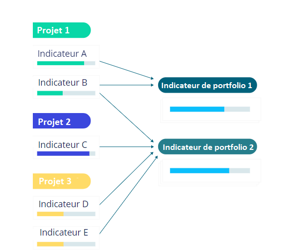 Establezca indicadores y metas para cada portafolio. Cada portafolio puede tener tantos indicadores de cartera como desee. Vincule los indicadores de proyecto que contribuyen a su respectivo indicador de portafolio y agregue las contribuciones de sus proyectos en tiempo real. Siempre tendrá a mano las últimas cifras para realizar un seguimiento del progreso actual de su organización contra las metas establecidas.